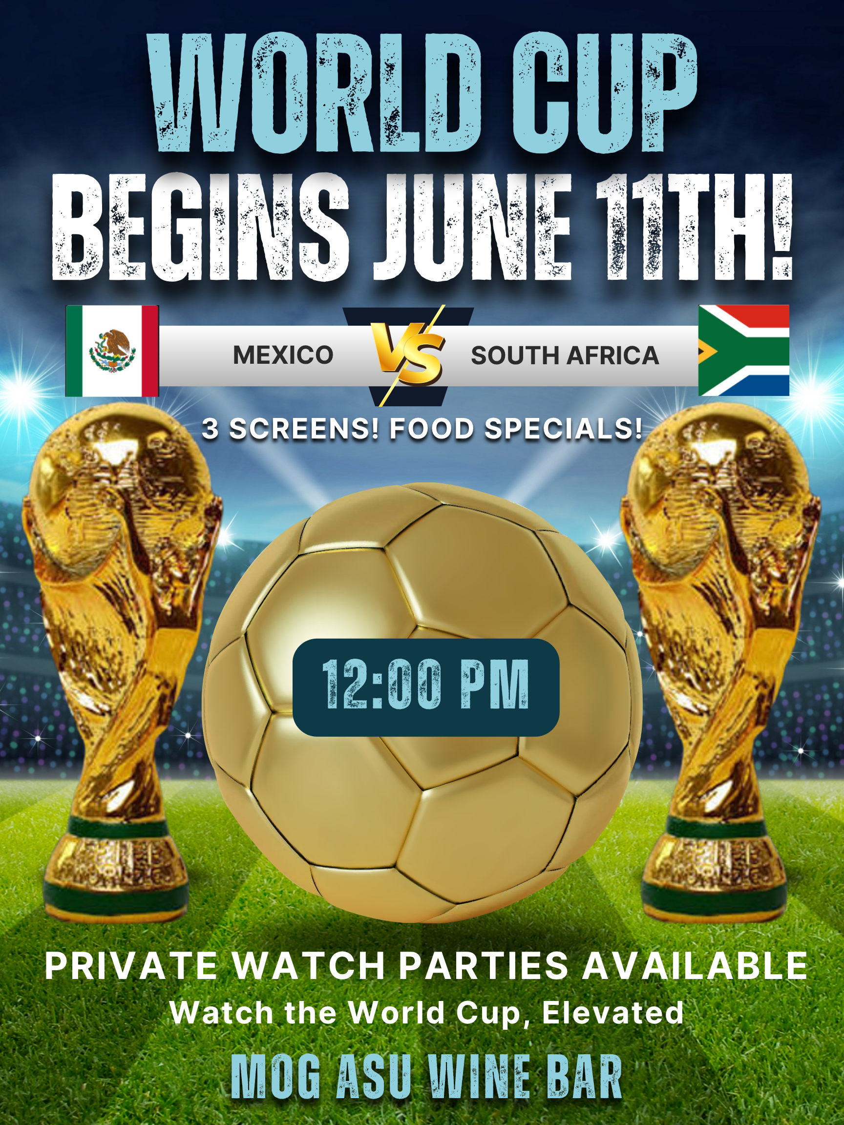 World Cup Begins!!! Thursday, June 11, 2026 12:00 PM 11:00 PM Mog Asu Wine Bar 1 Blackfield Drive Tiburon, CA, 94920 United States (map) Google Calendar ICS Gather your group and experience the World Cup at Mog Asu Wine Bar. With multiple screens, food specials, and a lively atmosphere, it’s the perfect place to host a private watch party. Reach out to inquire about availability and booking.